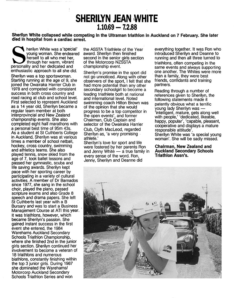 During 1987 again representing St Cuthbert’s, Sherilyn won all six of the Auckland Secondary School Senior Triathlon events and placed second at the NZ Secondary School National Championships. Such consistency in school and club events resulted in Sherilyn being voted Auckland’s Secondary School 1987 Female Triathlete of the year and regarded as one of New Zealand’s most promising young athletes. Later Sherilyn was posthumously named the 1988 New Zealand Secondary School Female Triathlete of the year.