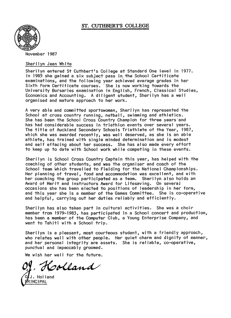 Sherilyn commenced her education at St Cuthbert’s College Epsom, (St Cuthbert’s), Auckland New Zealand in January 1977.